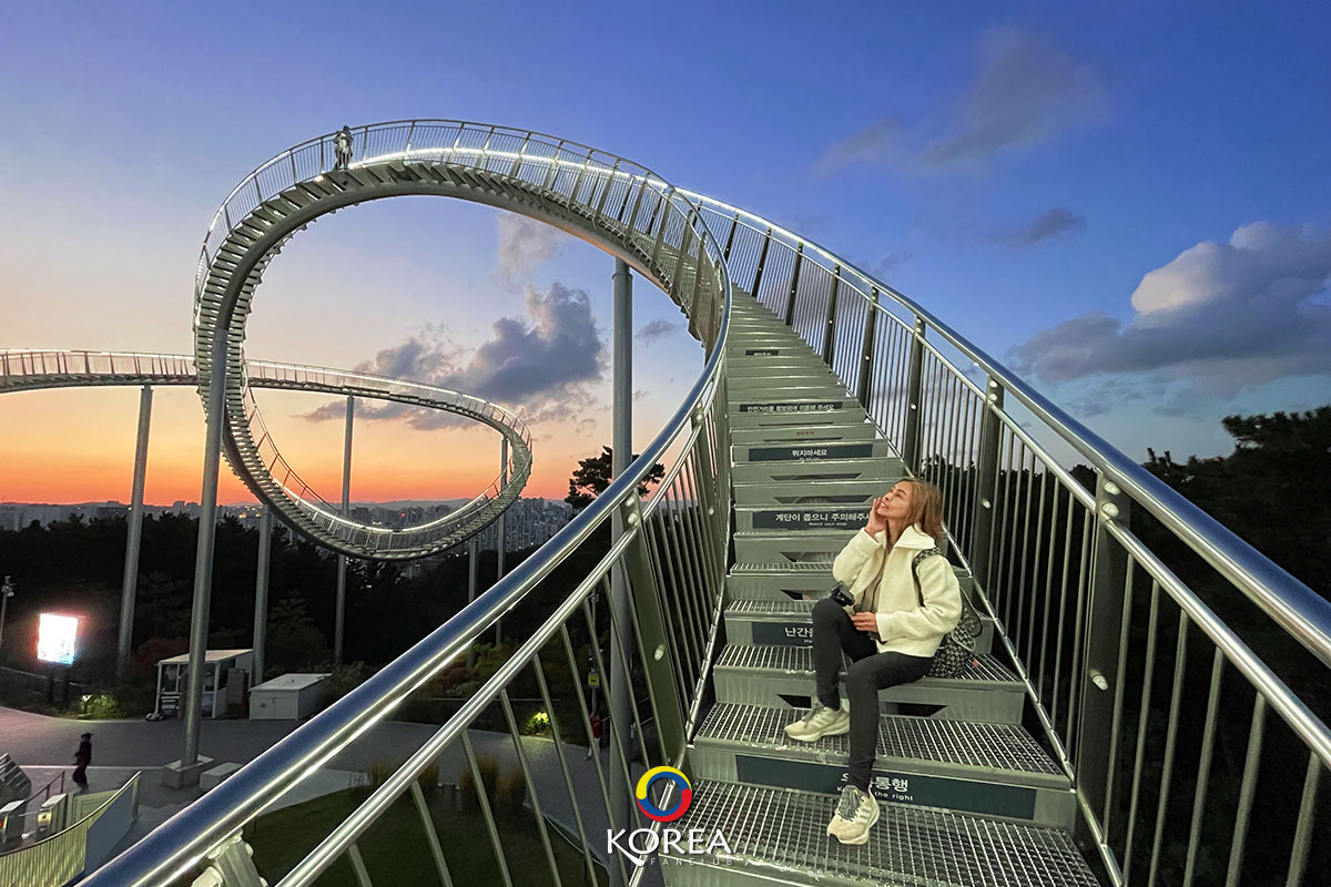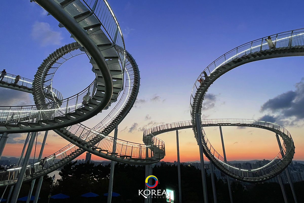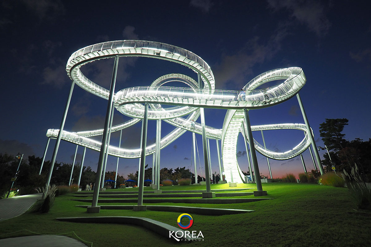 Hwanho Park Space Walk จัดให้เป็น สกายวอล์กที่ใหญ่ที่สุดในเกาหลี มีดีไซน์เหมือนรถไฟเหาะตีลังกา เราสามารถขึ้นไปได้ เสียวพอสมควร 555
