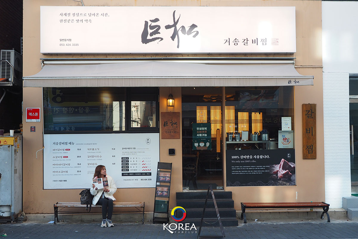 Geosong-Galbijjim (거송갈비찜) ร้านอาหารชื่อดังของเมืองแทกู ประเทศเกาหลีใต้ – เมนูเด่น เมนูดัง คือ คัลบิจิม (galbi jjim) ซึ่งเป็นซี่โครงเนื้อตุ๋นรสเผ็ดที่ได้รับความนิยมสูงสุด มีหลายสาขาในเมืองแทกู
