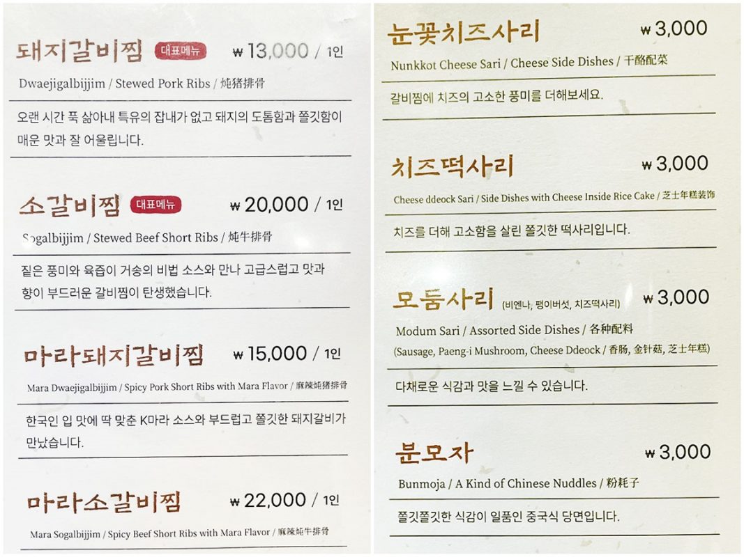 ความพิเศษของร้าน Geosong-Galbijjim (거송갈비찜) จะมี Dwaejigalbijjim ( ทเว-จี-คัล-บิ-จิม ) ซี่โครงหมูตุ๋นรสเผ็ด ( สำหรับคนที่ไม่กินเนื้อวัว ) และราคาซี่โครงหมูก็ถูกกว่าเท่าตัว ทำให้เมนูซี่โครงหมูตุ๋นรสเผ็ด ได้รับความนิยมขึ้นเรื่อยๆ