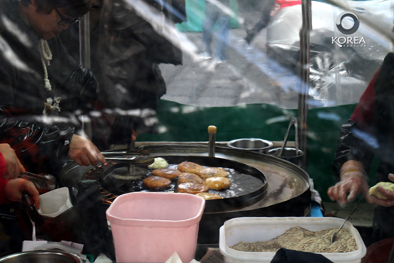 Hotteok (Sugar Filled Pancake) ขนมแป้งทอดทรงกลมๆ แบนๆ ใส่ถั่ว กับ น้ำตาลแดง ทอดในน้ำมันร้อนๆ