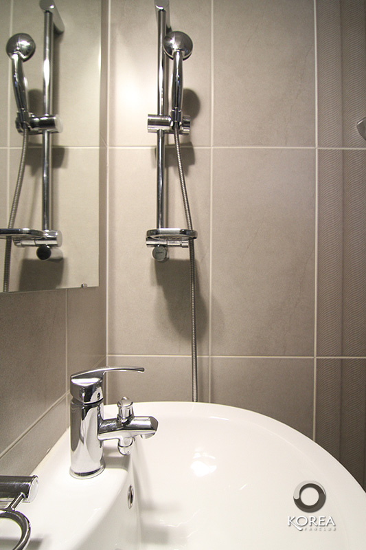 ห้องอาบน้ำ มีผักบัว และอ่างล้างหน้าอยู่ด้วยกัน ส่วนของชักโครก มีกระจกกั้นอยู่ทางขวามือ โรงแรมที่เกาหลีชักโครกจะเป็นแบบไฟฟ้า ที่รองนั่งปรับอุณหภูมิได้ มีปุ่มล้างชำระให้พร้อมปรับได้สนุกตามใจชอบ ชั้นวางของอยู่เหนือชักโครก ใช้พิ้นที่ได้ คุ้มค่า และเต็มที่จริงๆ ครับ