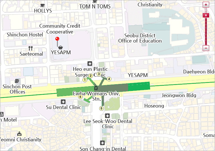 การเดินทาง : รถไฟใต้ดิน Line 2 Ewha Womans Univ. Stn. Exit 2
