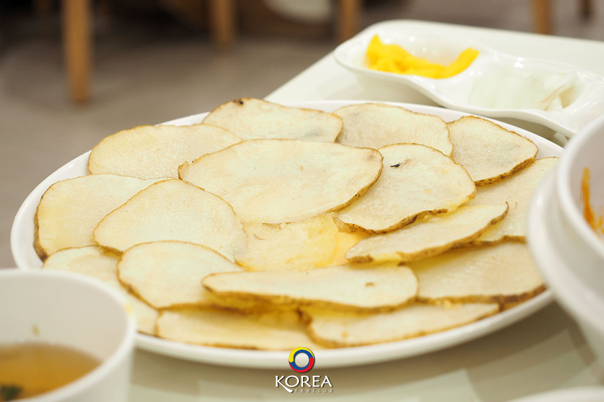 ตอนแรกน่ะ…บอกตรงๆ ว่าไม่คิดจะสั่งเลย ( แอบแพง ) แต่ เห็น ลูกค้า สั่งกันทุกโต๊ะ เหมือนว่า จะเอามากินคู่กับ Shilla-Je-Miyeon ประมาณว่า เอาความ จืดของแผ่นมันฝานบางๆ มากินเพื่อดับความเผ็ด